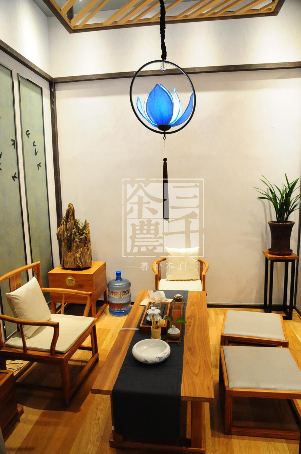第二,灯光的装饰。灯饰的颜色、形状与空间的搭配,可以营造出和谐氛围。比如说吊灯选用,新颖而又引人注目的款式可对整体环境产生很大的影响,不仅在空间上增加了审美效果,同时在茶客消磨的时间上也起到了调和柔化的作用。同样房间的多种灯具应该保持色彩协调或款式接近,如三千茶农原木色的茶柜,配上清新又雅致的蓝色荷花型吊灯,即赏心悦目又增加整个空间的能量,还具有时尚简约的风格,提升经营者的运势。
